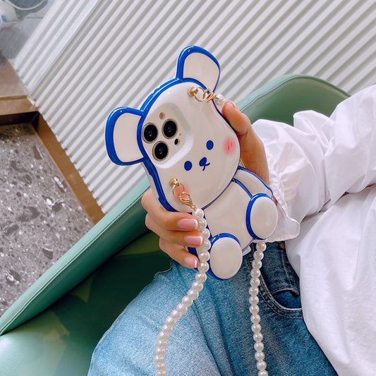 スマホケース H5「光沢ベア」パールストラップ付き ホワイトとブルー