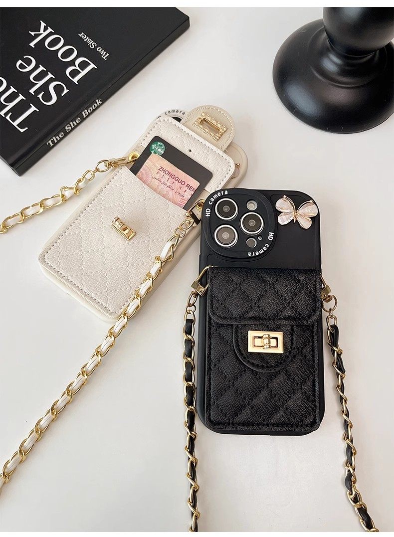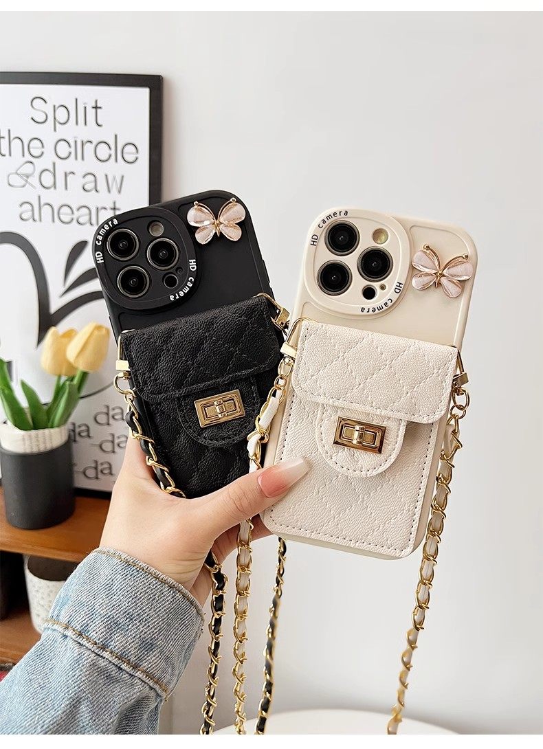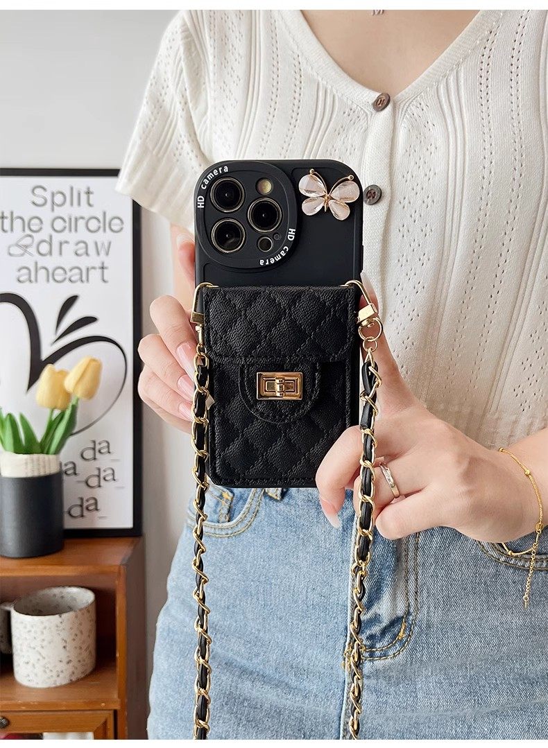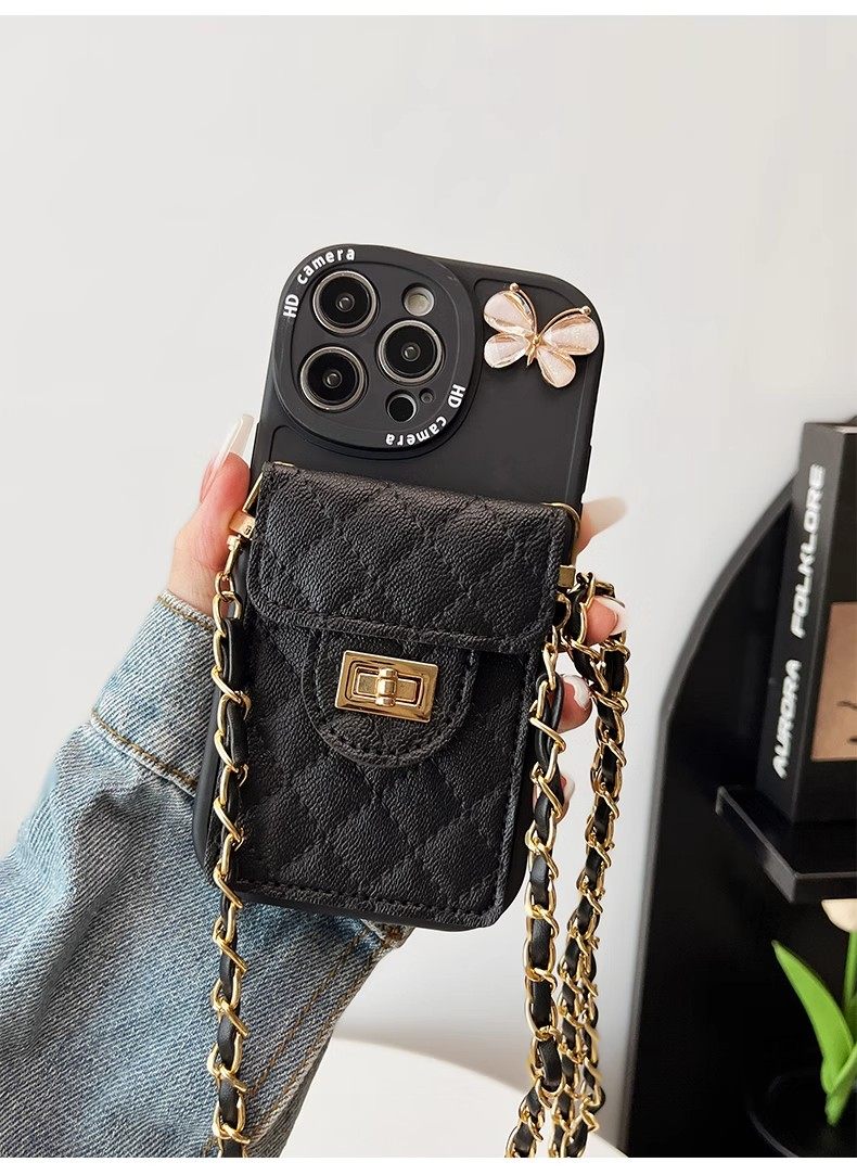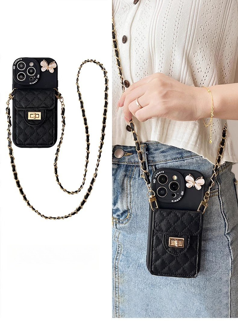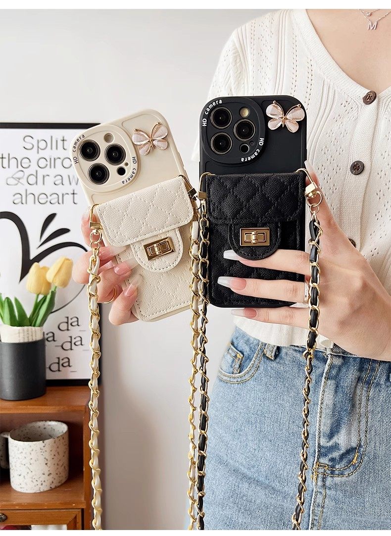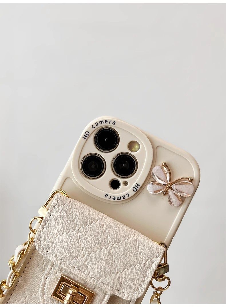 The new French diamond butterfly card bag is suitable for Apple mobile phone case, the new 16pro lambskin 15 crossbody lanyard can be strapped, all-inclusive leather small fragrance 13 all-inclusive anti-drop 12 silicone