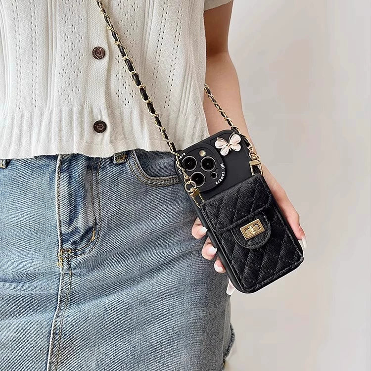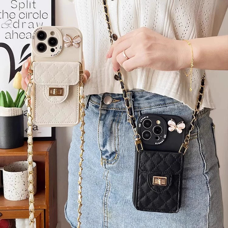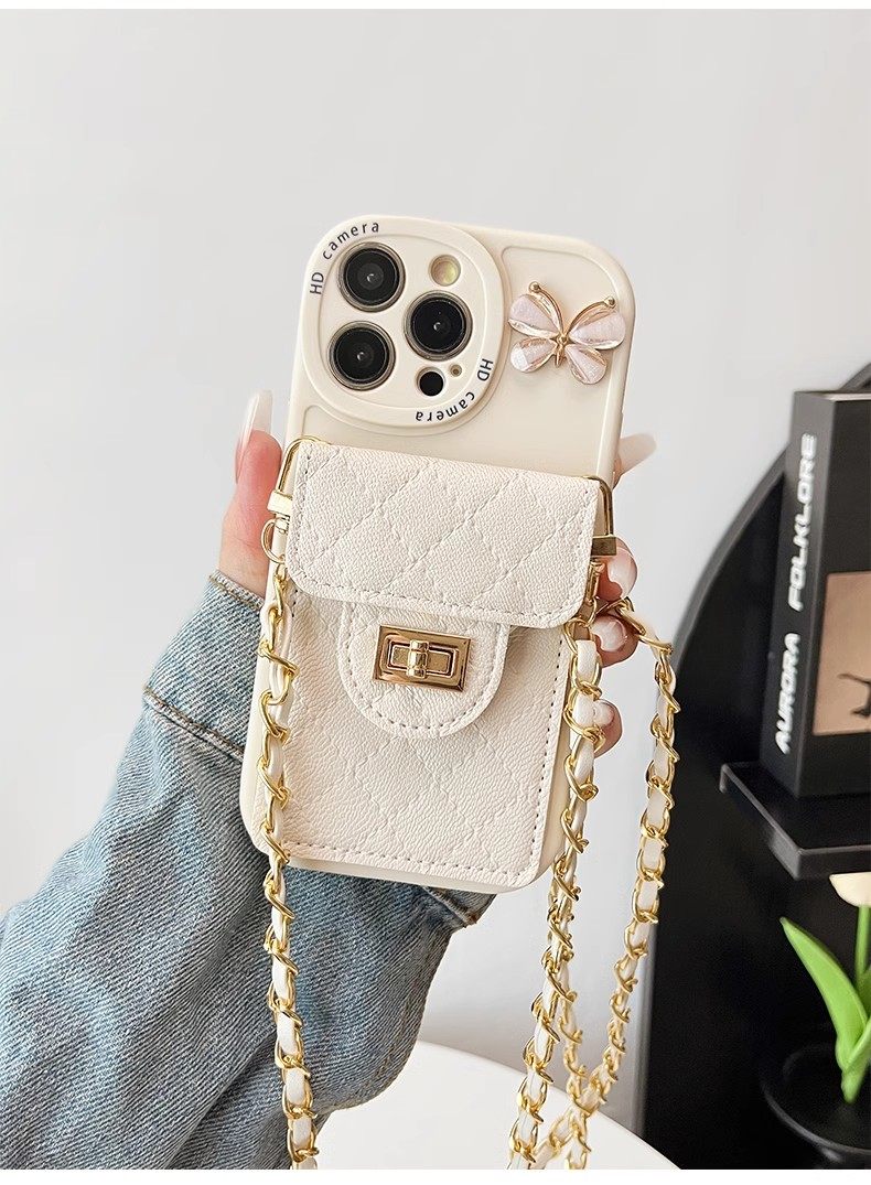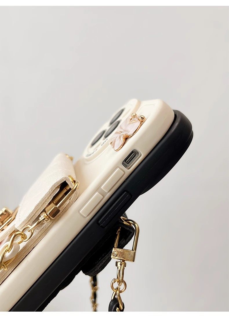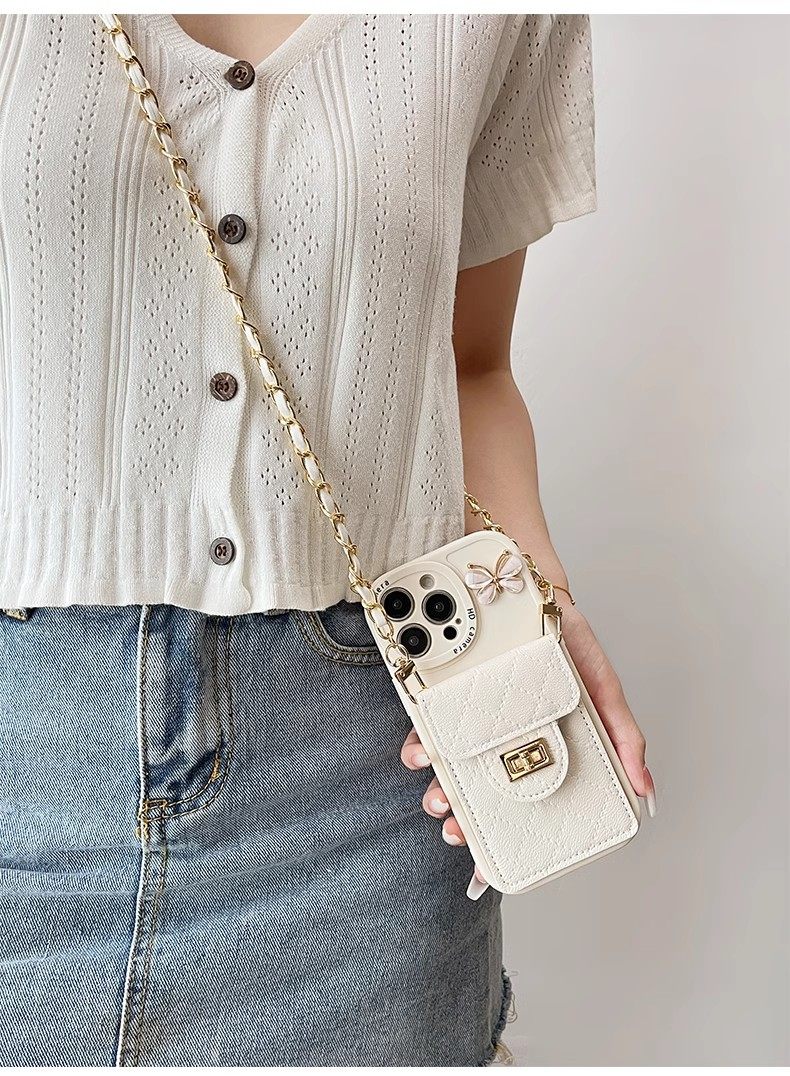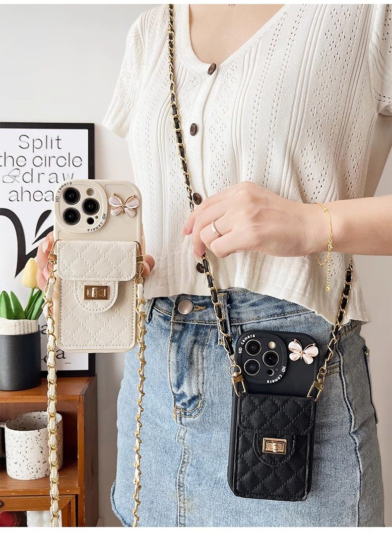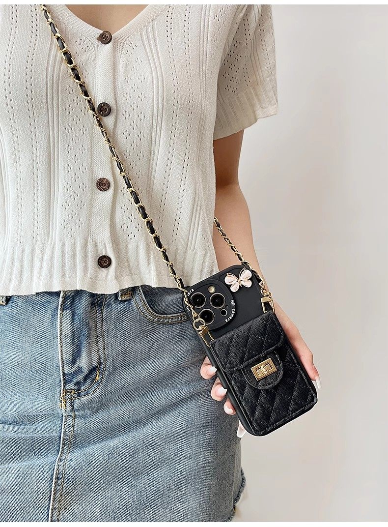 The new French diamond butterfly card bag is suitable for Apple mobile phone case, the new 16pro lambskin 15 crossbody lanyard can be strapped, all-inclusive leather small fragrance 13 all-inclusive anti-drop 12 silicone